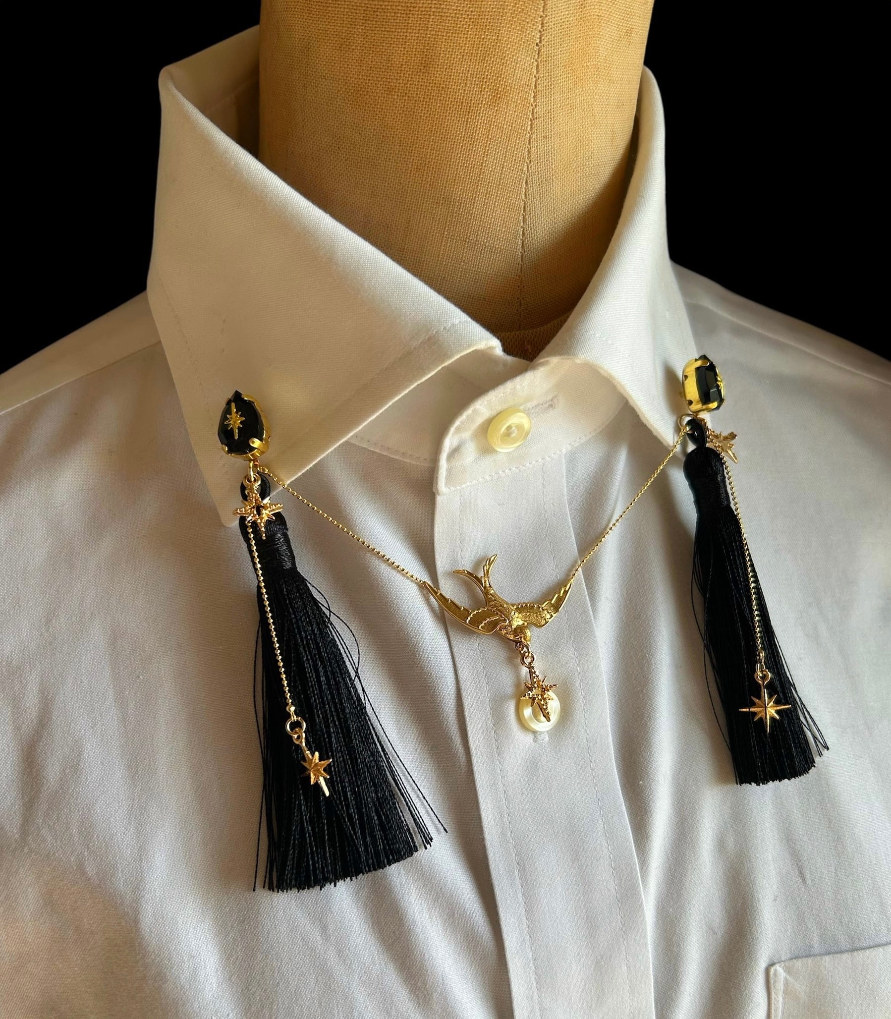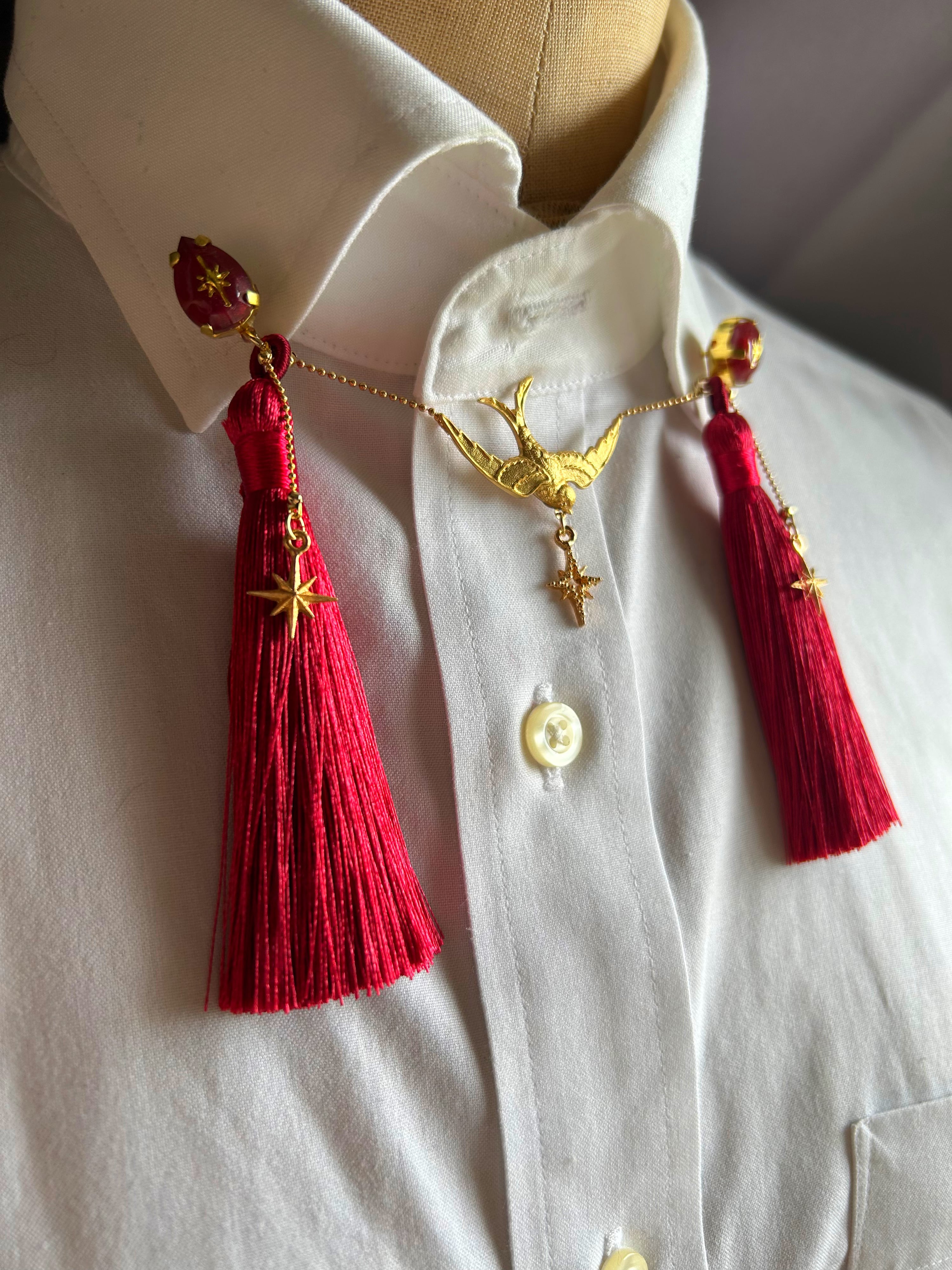 「物憂し」は、襟飾りに揺れるツバメのモチーフが特徴的な一品です。この襟飾りは、あなたのコーディネートに華やかさと上品さを与え、特別な瞬間に演出を添えます。