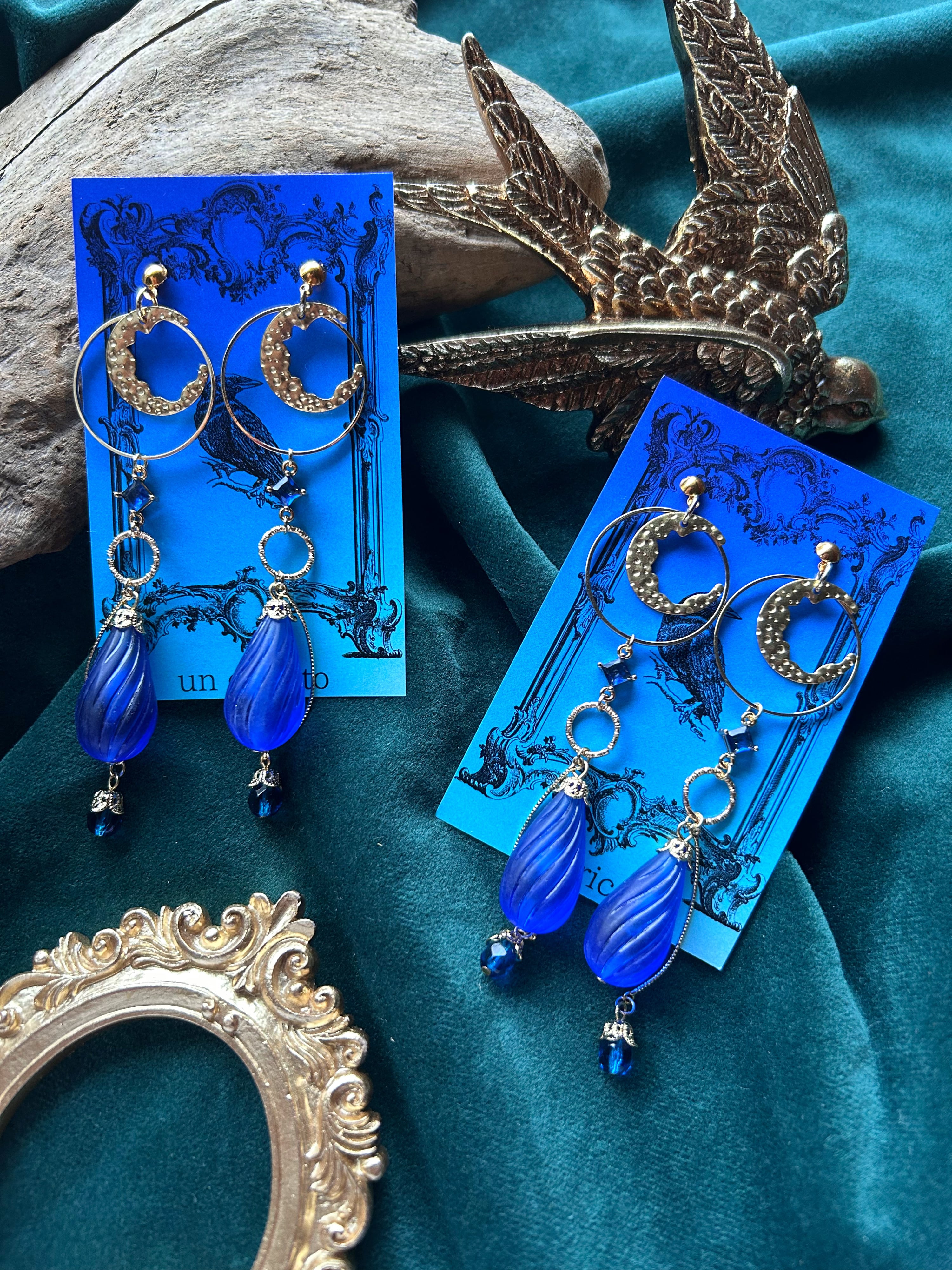 「耳打ち」は、鮮やかなブルーの耳飾りで、雫型のビーズはヴィンテージバーズを使用した特別なアイテムです。この耳飾りを身につけることで、あなたのスタイルに洗練された美しさと個性的な魅力をプラスし、周囲の視線を引きつける存在感を与えます。美しいブルーが華やかさを引き立て、日々のコーディネートに彩りを加えます。