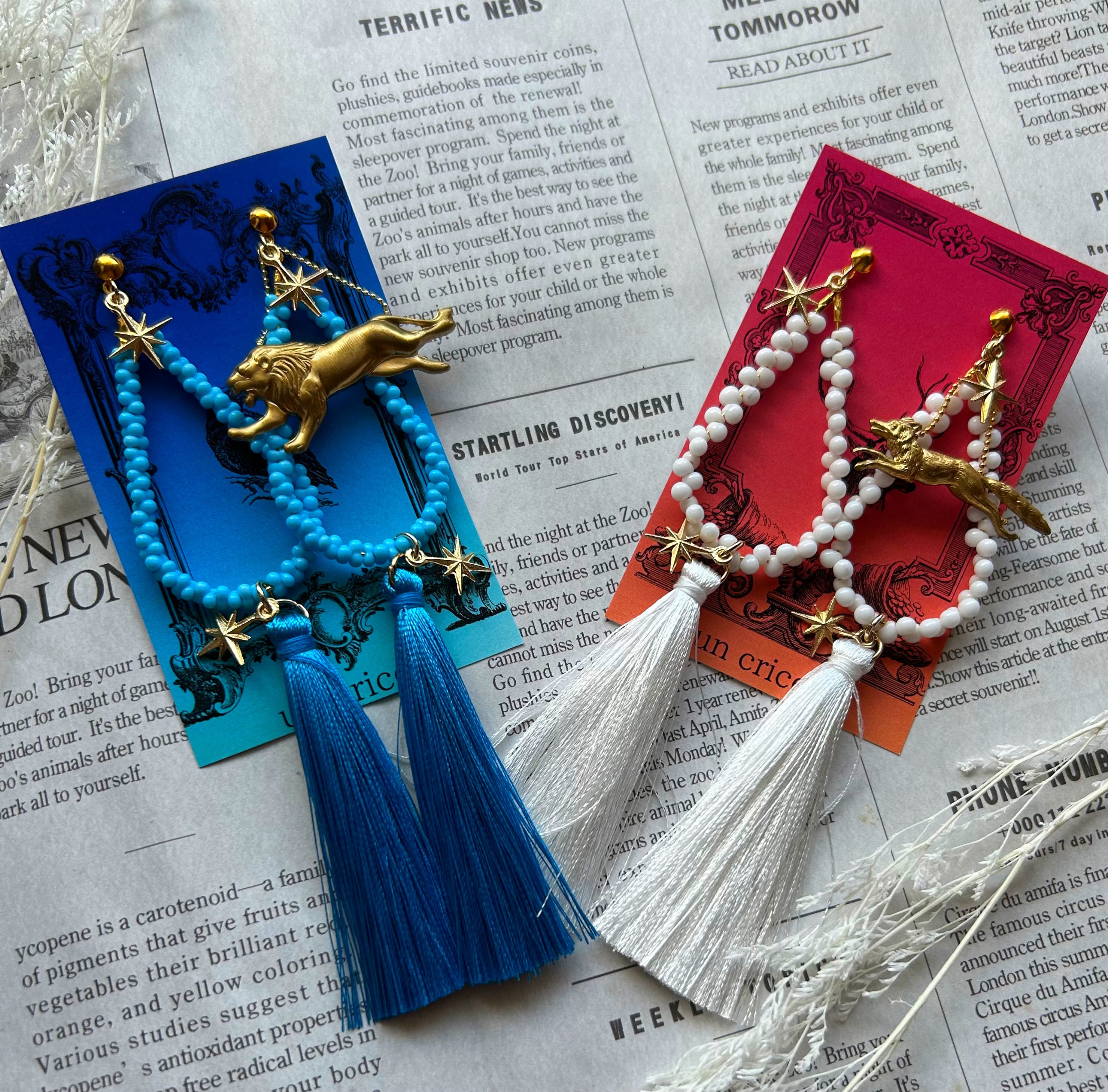 鮮やかなブルーが目を引くライオンモチーフと白の雪景色を駆けるキツネを思わせる耳飾りです。