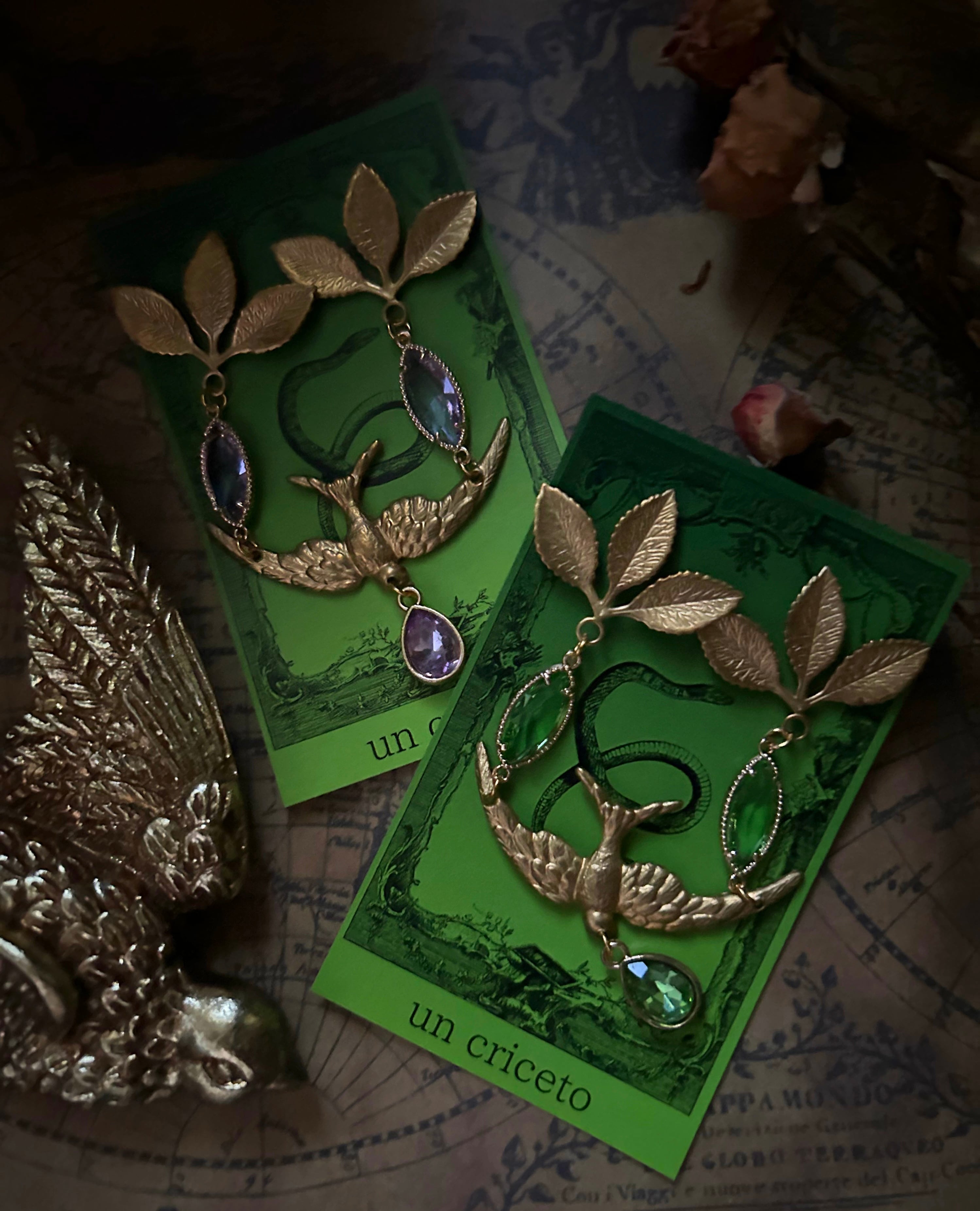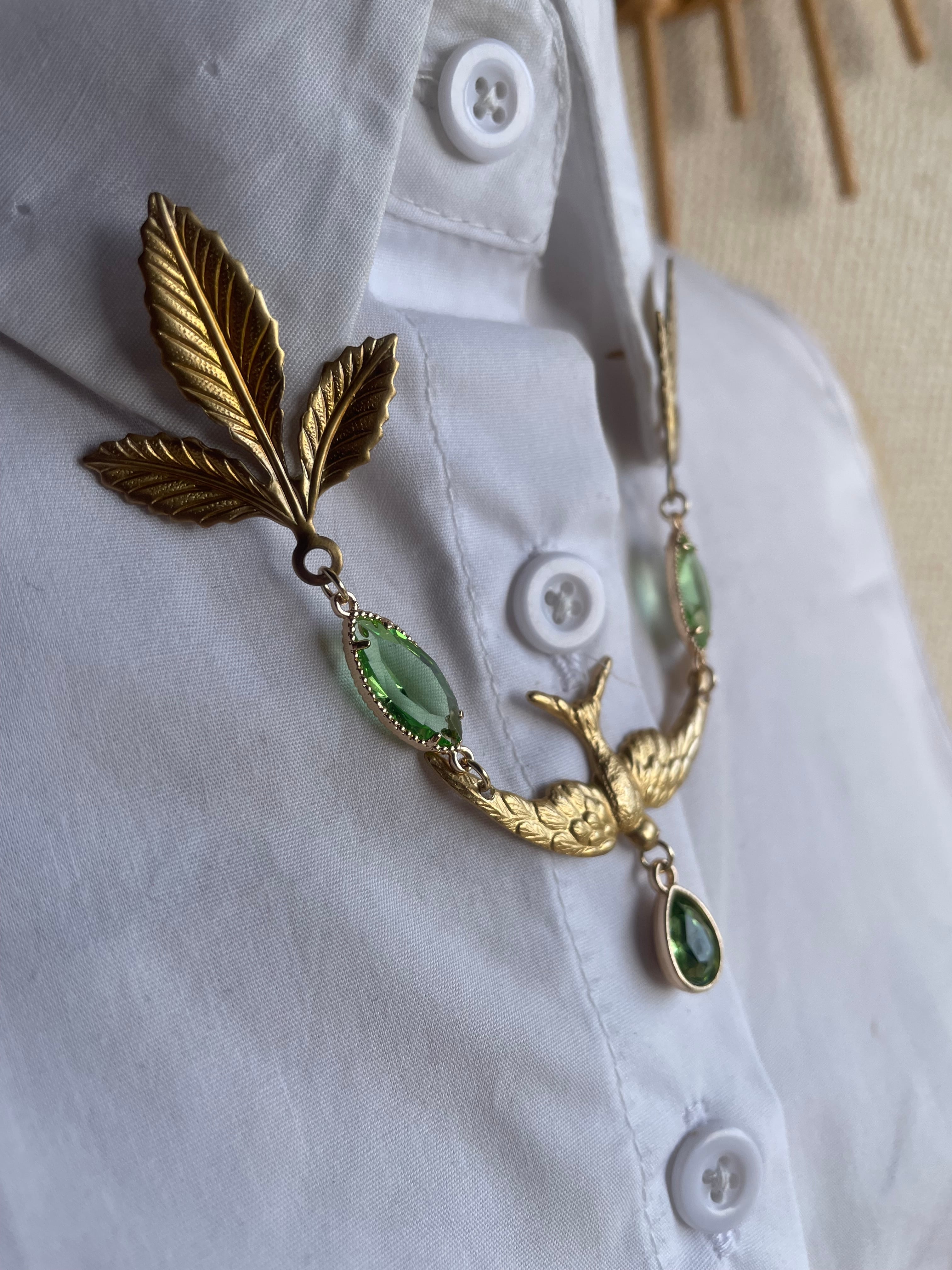 朝羽振るは、爽やかなグリーンカラーをベースにゴールドの細工が美しい鳥のモチーフが印象的な襟飾りです。エレガントな印象を与えます。季節を問わず、様々なシーンで活躍すること間違いなしです。